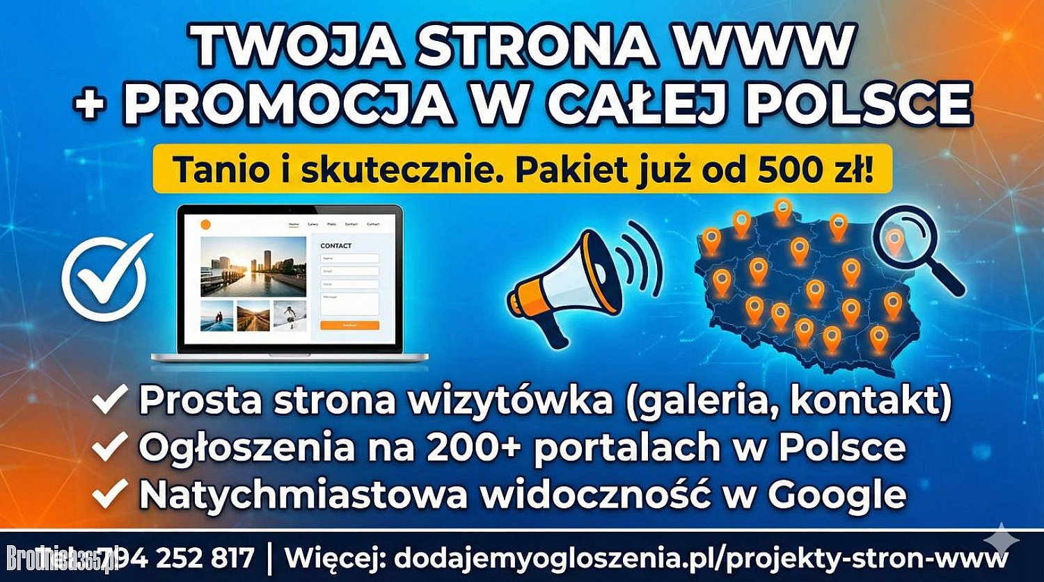 W ramach oferty „Strona WWW - pakiet standardowy” dodamy ogłoszenie promujące Twoją stronę do 200 portali ogłoszeniowych w całej Polsce - zarówno regionalnych, jak i ogólnopolskich.
